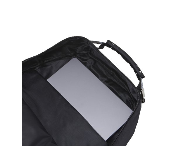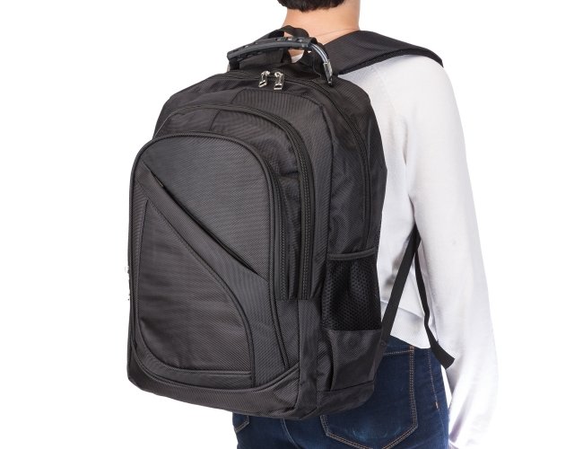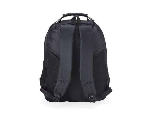 Mochila de nylon 30 litros com quatro compartimentos, sendo o principal com bolso para notebook 15,6. A mochila possui bolsos laterais em malha, duas alças de mãos e área costada com revestimento espumado.