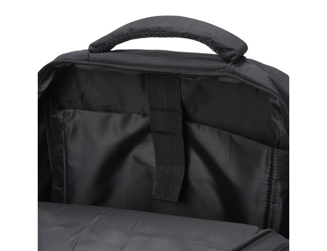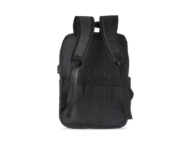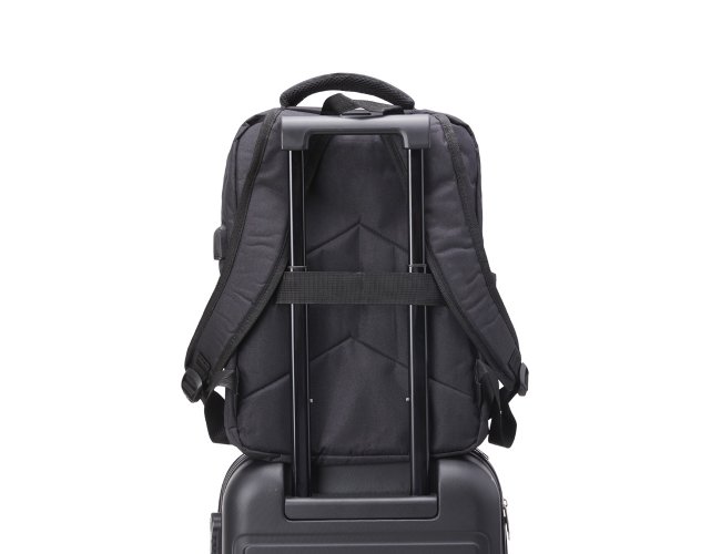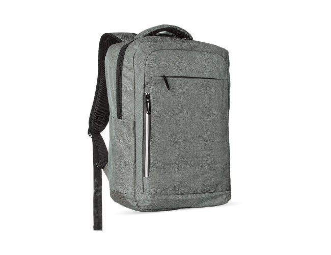 Mochila de nylon 20 litros com três compartimentos, sendo o principal com bolso para notebook 15,6. Com bolsos laterais e faixa frontal refletiva, a mochila possui adaptador USB externo, alça para encaixe em malas de viagem, duas alças de mãos e alças para as costas com revestimento espumado. Acompanha plaquinha metálica.