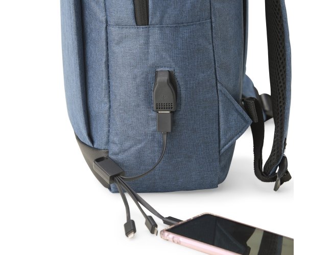 Mochila de nylon 21 litros com detalhe em couro sintético, três compartimentos, sendo o principal com bolso para notebook 15,6. Com divisórias internas para acessórios, a mochila possui bolso lateral e suporte externo usb.