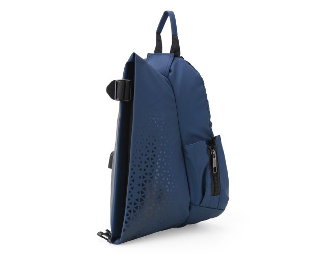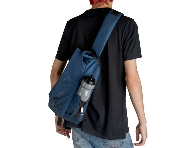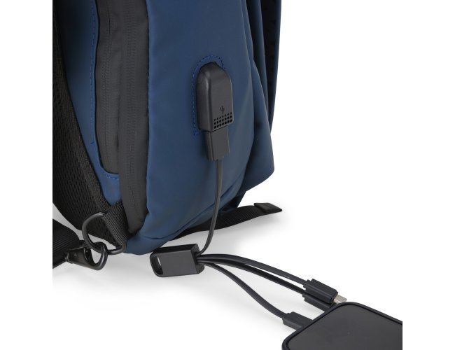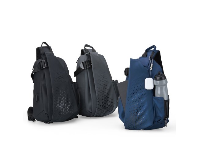 Mochila de ombro de 10 litros com 3 compartimentos. Possui na parte superior abertura com velcro para diversos itens esportivos, como raquetes de tênis, squash e badminton. A mochila contém dois bolsos para tablet, bolso lateral com zíper, divisórias internas para acessórios, alça ajustável, área costal com revestimento espumado e suporte externo USB.