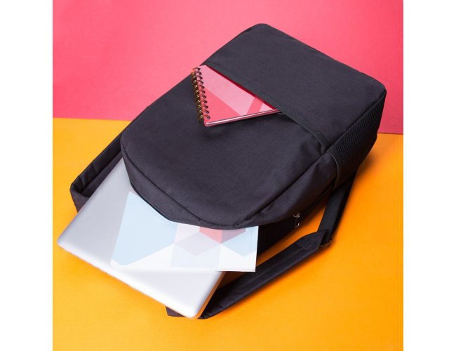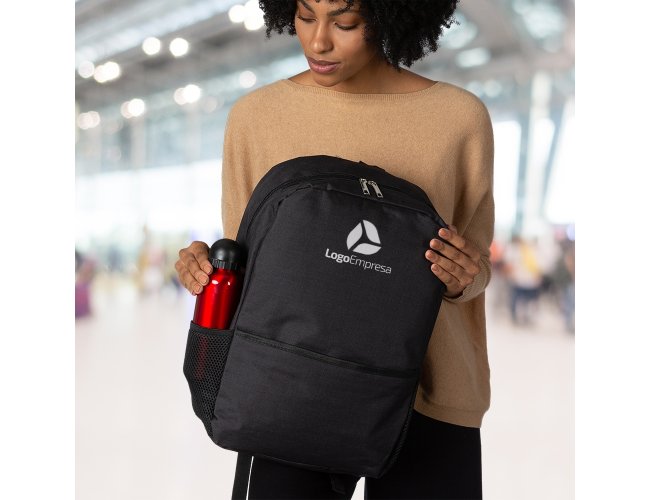 Mochila de poliéster 24 litros com dois compartimentos, sendo o principal com bolso para notebook 156. A mochila possui bolsos laterais em malha e área costada com revestimento espumado.