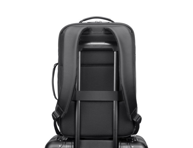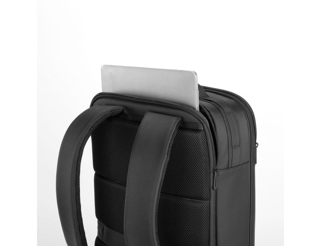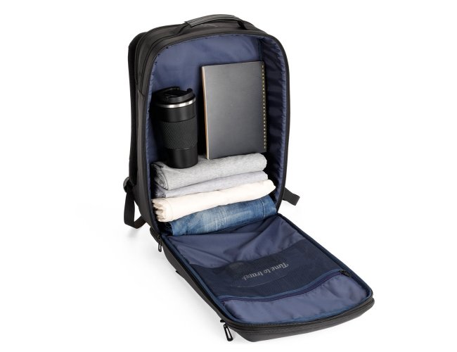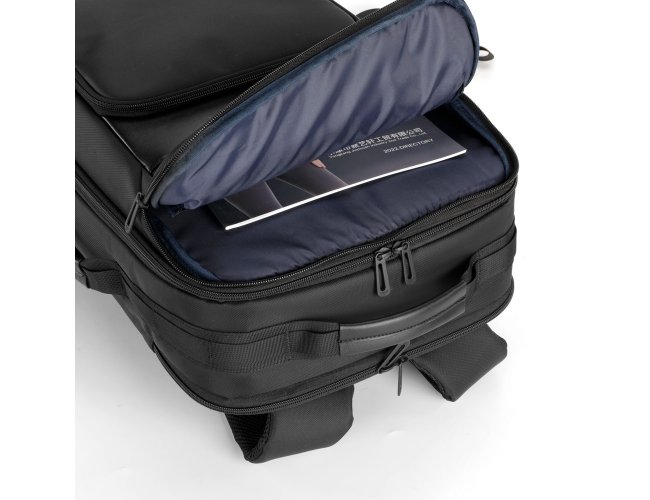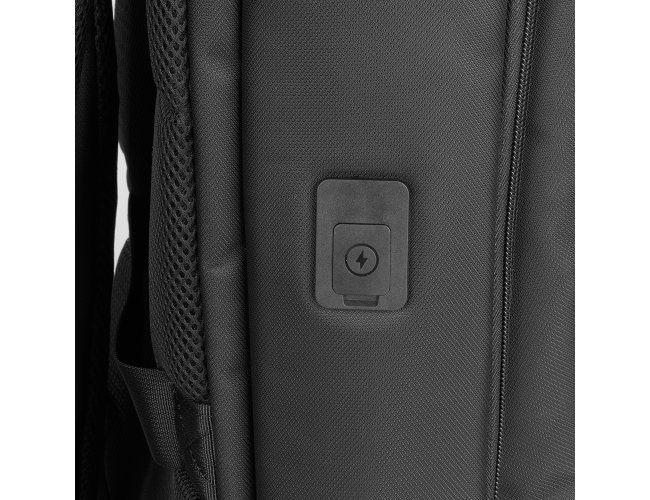 Mochila de 27 litros premium em poliéster impermeável com cinco compartimentos, sendo um deles para notebook 15,6. Com divisórias internas para documentos e bolso telado com zíper, a mochila possui adaptador USB externo, área costada e alças para as costas com revestimento espumado, alça de engate para malas de viagem e duas alças de mãos, sendo uma delas lateral para o transporte da mochila no modo pasta.