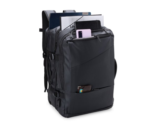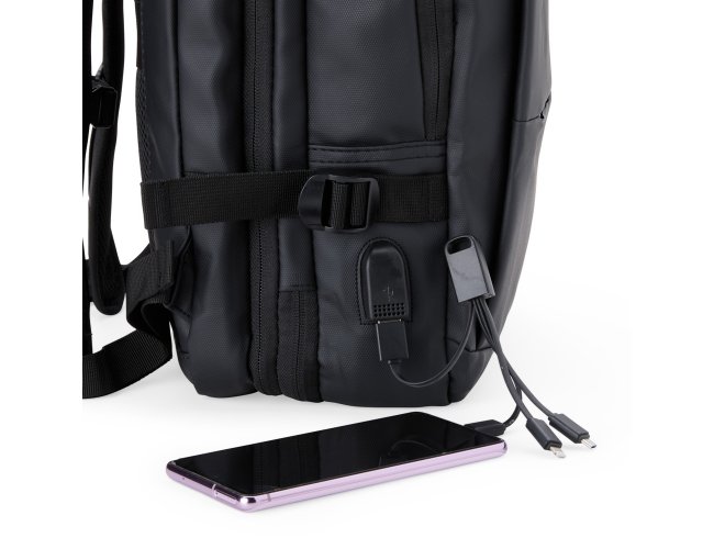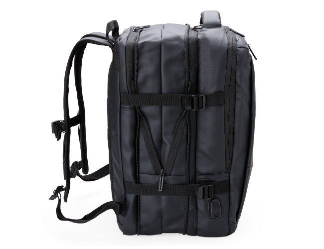 Versátil e amplo espaço, nossa mochila de 36 litros atende às necessidades do escritório a viagens profissionais, unindo funcionalidade e visual executivo. Com design expansivo, permitindo aumentar sua capacidade de carga quando necessário, é resistente à água e combina a sofisticação do couro sintético com a versatilidade para o dia a dia. Possui três compartimentos, sendo um deles para notebook de até 15,6? e espaço para tablet. Outro compartimento que se destaca é o expansivo, com fivelas ajustáveis. Este espaço possui abertura lateral e inclui uma cinta compressora para deixar as peças presas e seguras. Além disso, a mochila possui uma alça na lateral, transformando-a em uma mala quando desejar, compartimentos como bolsos interno, divisórias para acessórios, entrada para USB, alças ajustáveis e de compensação para distribuir o peso de forma mais equilibrada, engate para mala de viagem garantindo mais praticidade ao caminhar, dois bolsos na parte frontal com fechamento por zíper e para deixá-la mais completa acompanha uma plaquinha de metal, permitindo a personalização exclusiva. Essa mochila é perfeita para o seu cliente levar tudo o que precisa e mais um pouco!