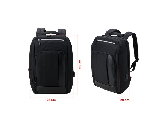 Mochila confeccionada em Nylon 22 litros com detalhes em couro sintético. Contém 5 compartimentos, sendo um bolso com faixa refletiva, divisórias internas para acessórios, bolso para tablet e notebook 15.6, bolso antifurto nas costas, bolso externo na lateral com elástico, suporte externo USB, alça para encaixe em malas de viagem, alças da mochila possuem bolsos integrados para suporte de óculos e cartões.