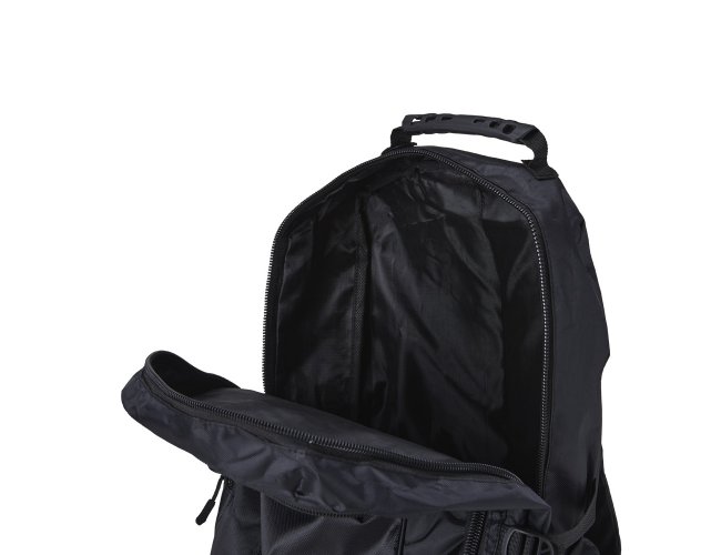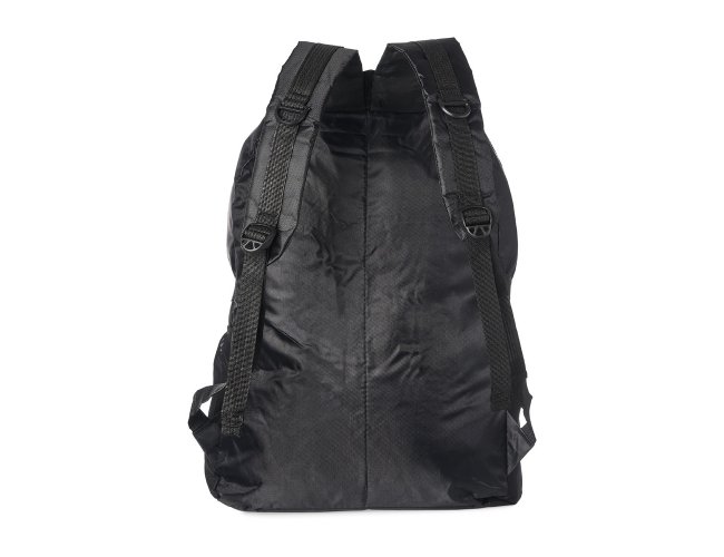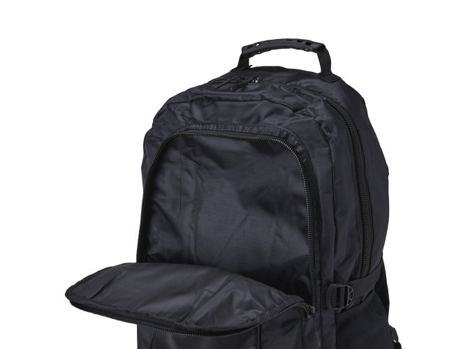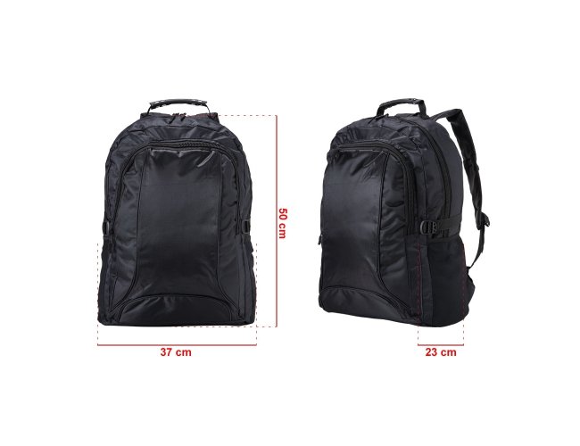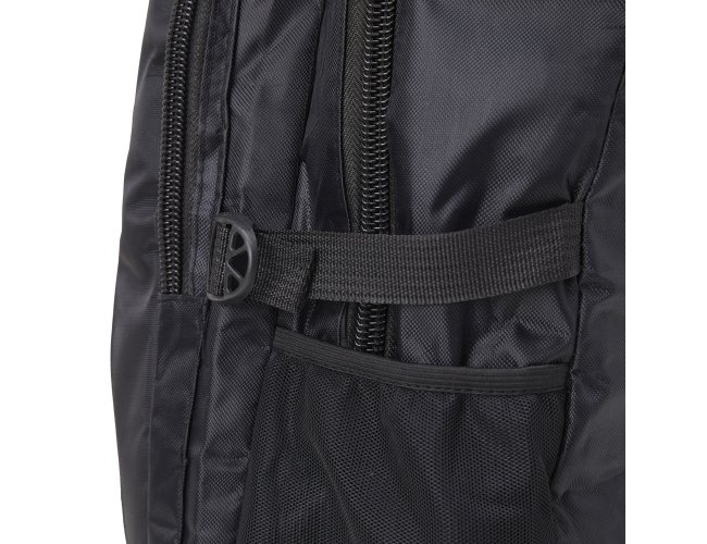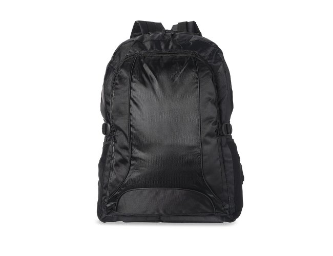 Mochila de nylon 35 litros com dois compartimentos e bolsos laterais em malha. Possui fivelas laterais para regulagem de tamanho e duas alças de mãos, sendo uma delas reforçada com pegador plástico.