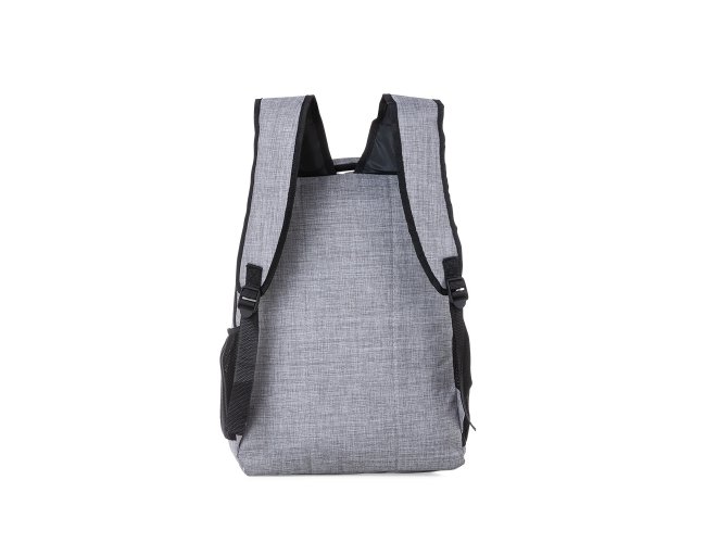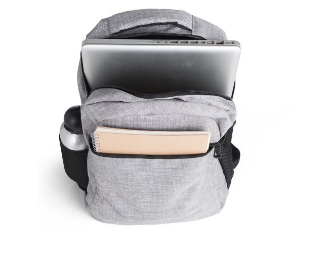 Mochila confeccionada em poliéster com compartimento para notebook até 15,6 polegadas. Contém um compartimento grande, compartimento frontal e bolsos laterais em malha. Alça de mão com revestimento espumado e alças para as costas ajustáveis.