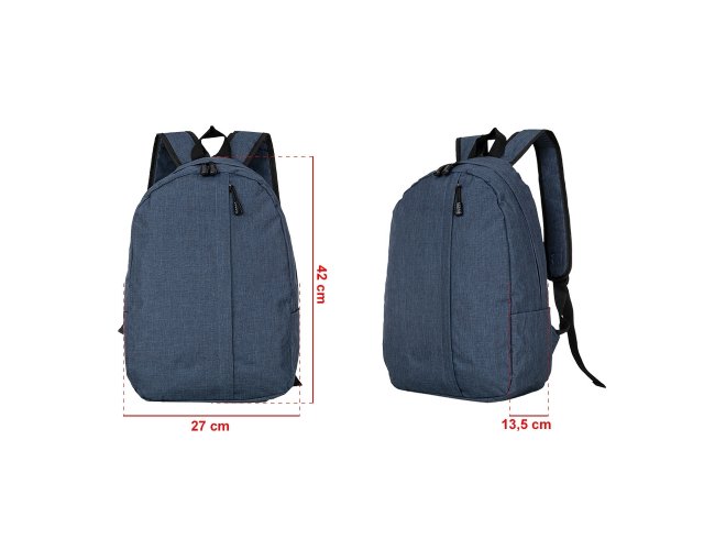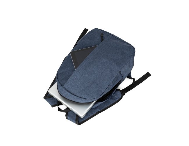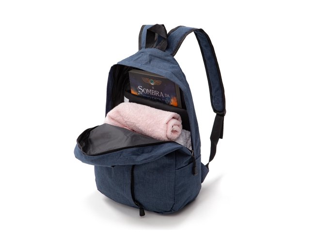 Mochila em poliéster com compartimento para notebook até 14 polegadas. Contém um compartimento grande, compartimento frontal e bolsos laterais. Alça de mão em nylon e alças para as costas ajustáveis.