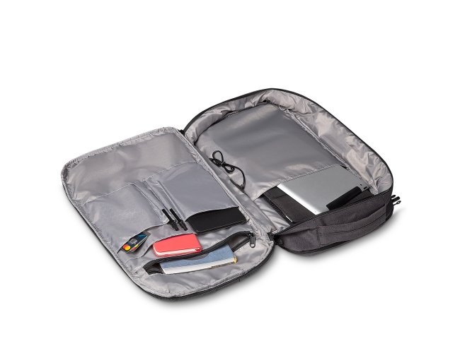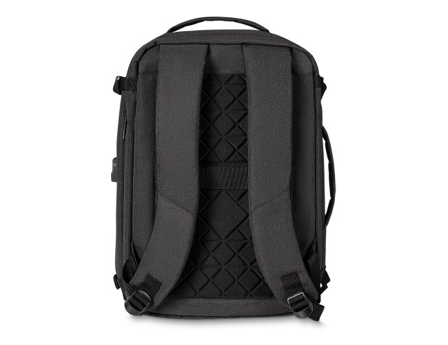 Mochila confeccionada em poliéster com compartimento para notebook até 17 polegadas. Contém Dois compartimentos grandes sendo um com divisórias para documentos, eletrônicos e caneta, e um com divisória para Notebook até 17 polegadas. Compartimento frontal com abertura vertical. Tecido Impermeável. Alça traseira para conter as alças de ombro. Adaptador USB externo com cabo acoplado, permitindo a conexão de um carregador portátil de dentro da mochila e transferência da carga para o lado externo, ocultando o carregador e viabilizando a utilização do celular durante o processo. Contém zíperes com pegadores metálicos, alça de mão em nylon, alças para as costas ajustáveis com revestimento espumado antitranspirante e alça lateral que possibilita que a mochila seja carregada como uma pasta