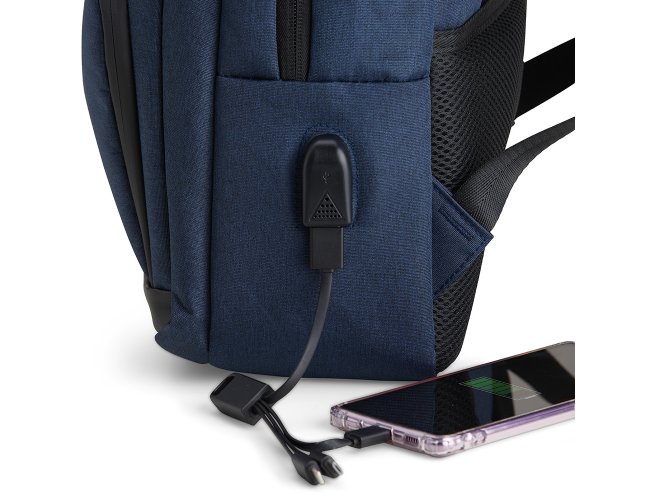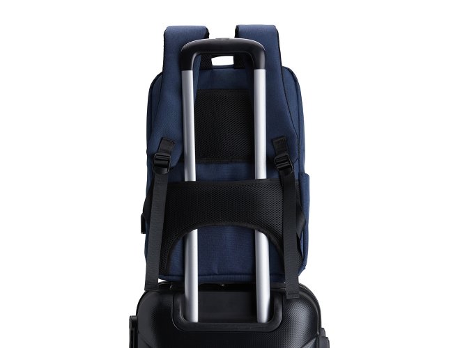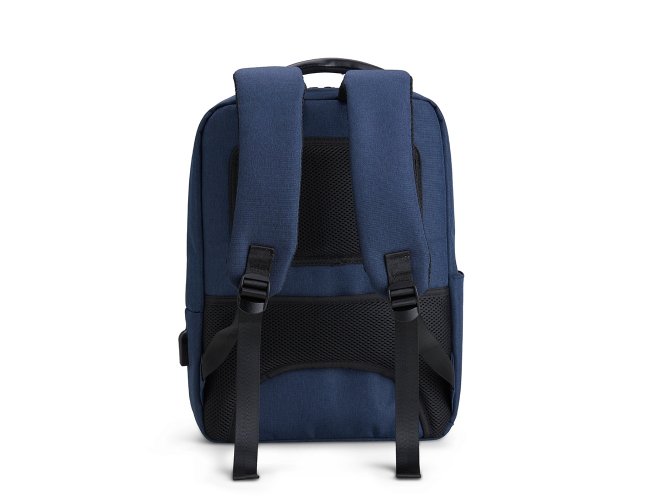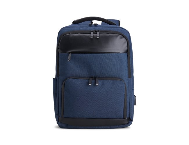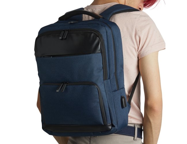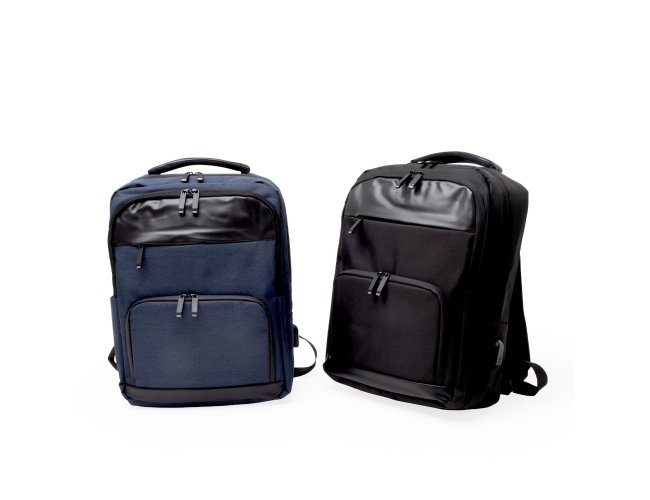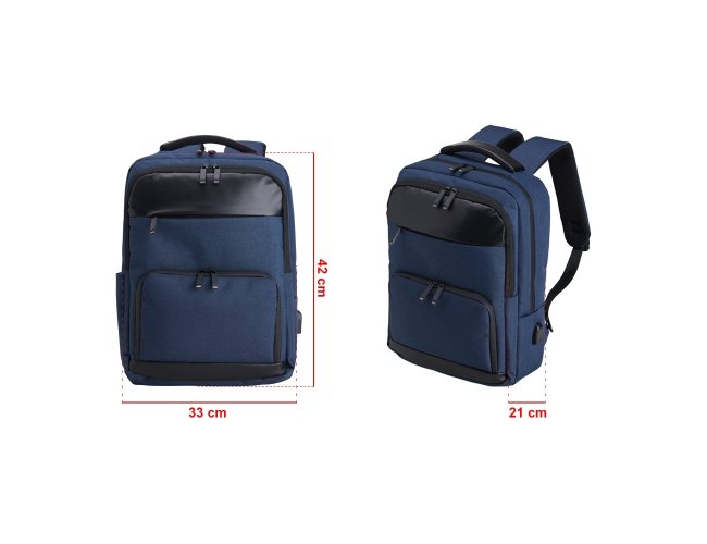 Mochila de Poliéster 23 litros com detalhes em couro sintético. A mochila possui 4 compartimentos, sendo o principal com bolso para notebook 15,6 polegadas. Contém divisórias internas para acessórios, bolso lateral, alça para engate em malas de viagem e suporte externo USB.
