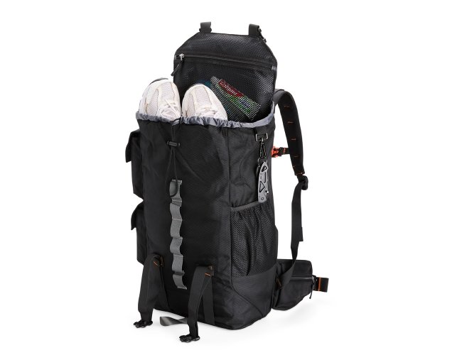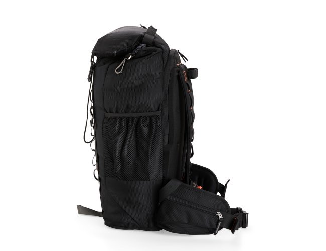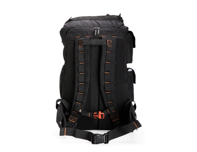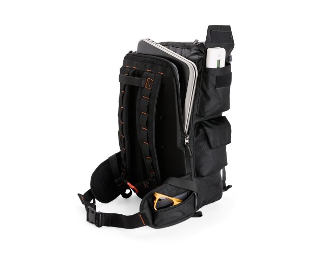 Mochila confeccionada em poliéster impermeável, fechamento por cordão e engate rápido plástico e capacidade máxima de 25 litros. Possui amplo espaço interno com divisória com fechamento em velcro e bolso em tela de nylon próximo à abertura. Apresenta três compartimentos externos: um com fechamento em zíper e dois em velcro nas laterais, além de um bolso lateral em tela de nylon. A parte traseira da mochila conta com outros três compartimentos em diferentes tamanhos, incluindo espaço para notebooks de até 15,6 polegadas.