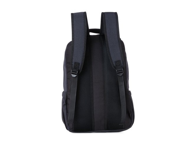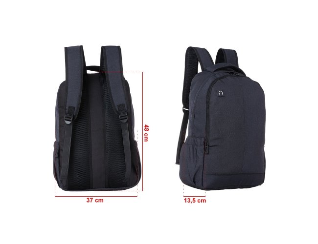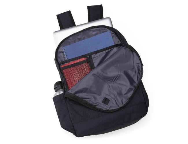 Mochila poliéster com compartimento para notebook. Possui um compartimento superior com bolso interno para notebook, segundo compartimento superior com divisórias internas para documentos e bolso de tela além de um saída interna para fones de ouvido e dois bolsos nas laterais. Alça de mão, alças ajustáveis para as costas revestidas com espuma e parte traseira também revestida com espuma para um maior conforto.