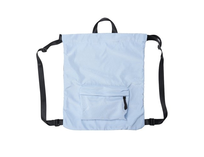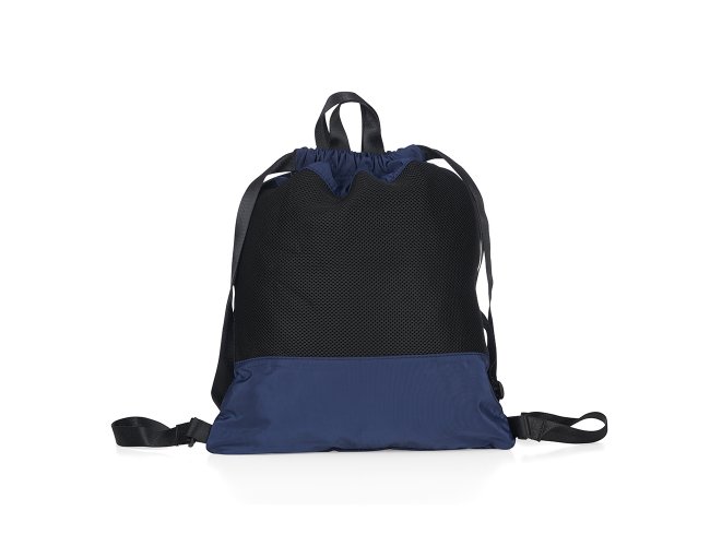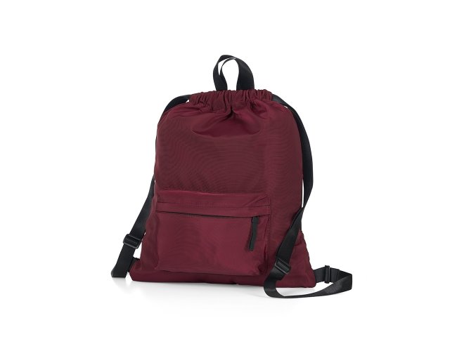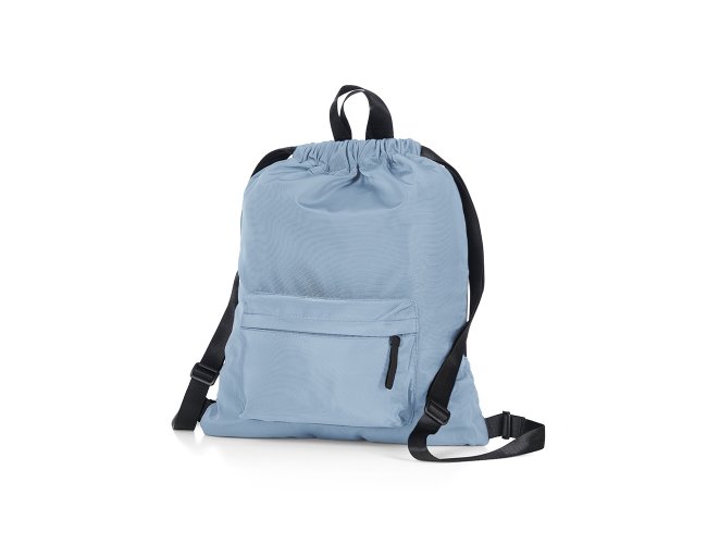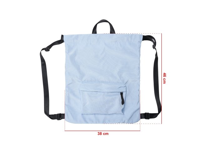 Mochila saco feita em poliéster resistente à água com alças reforçadas de nylon. Possui ainda um bolso frontal com fechamento em zíper.