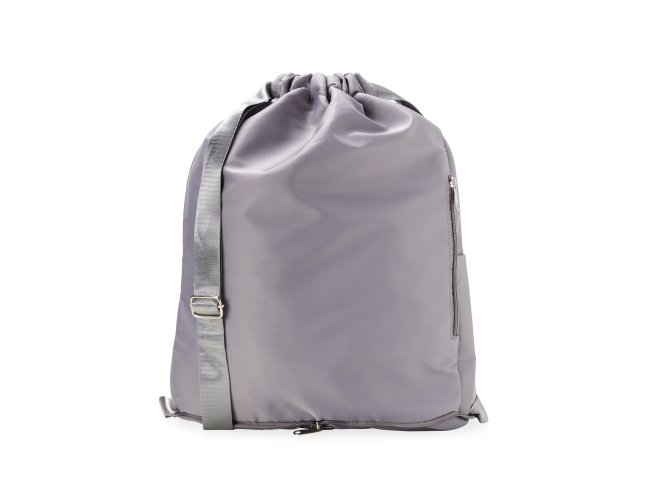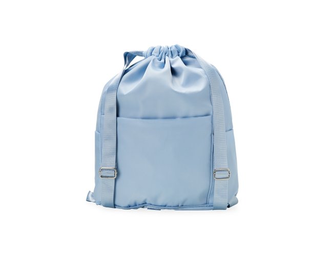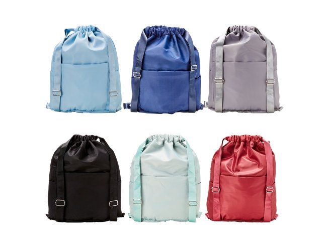 Mochila saco confeccionada em poliéster impermeável com alças em nylon reguláveis. Dispõe de três compartimentos em tamanhos diferentes, incluindo dois bolsos laterais e um bolso interno para itens molhados