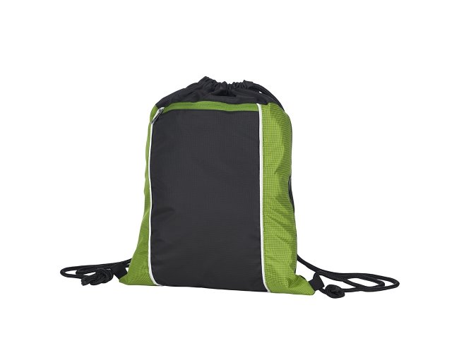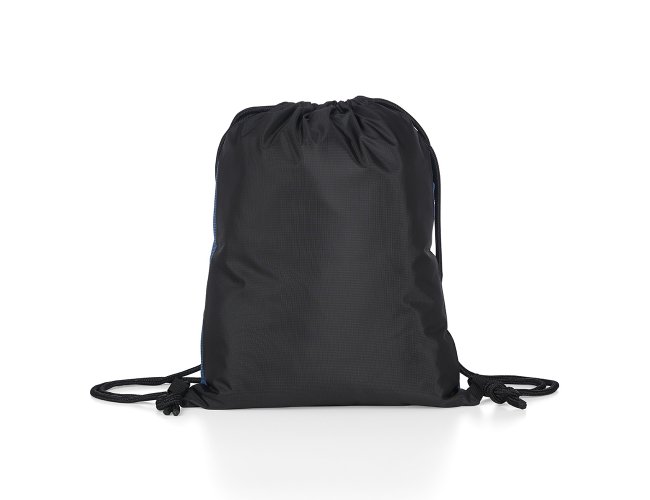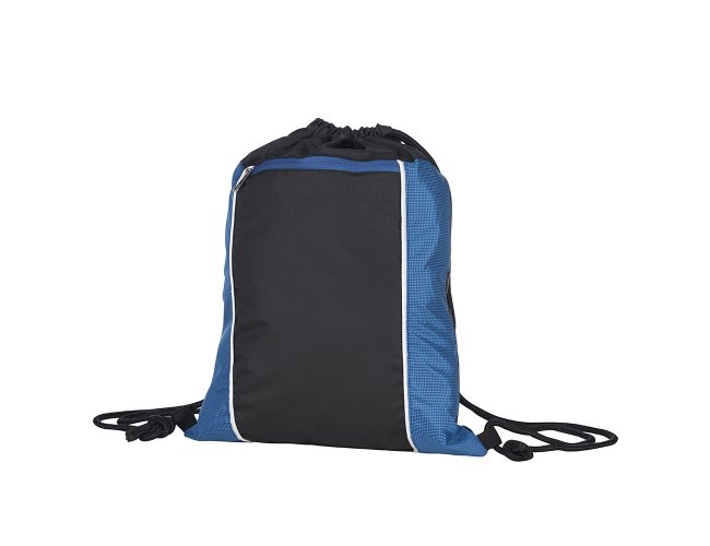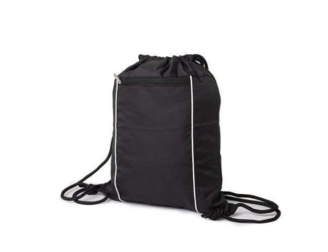 Mochila saco feita em poliéster resistente à água com alças reforçadas de nylon. Possui ainda um bolso frontal com fechamento em zíper.