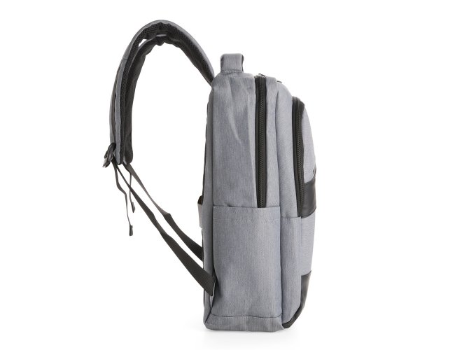 Mochila confeccionada em Oxford Jacquard impermeável com detalhes em couro sintético e capacidade de até 15,6 litros. Possui compartimento principal com bolsos em diferentes tamanhos e uma divisória para notebooks de até 15,3 polegadas. Conta com entrada externa para cabos USB-A e USB-C, dois compartimentos frontais com zíper e dois bolsos laterais abertos. Dispõe ainda de alça superior, duas alças de costas e painel traseiro acolchoados, além de engate em nylon para malas de viagem.