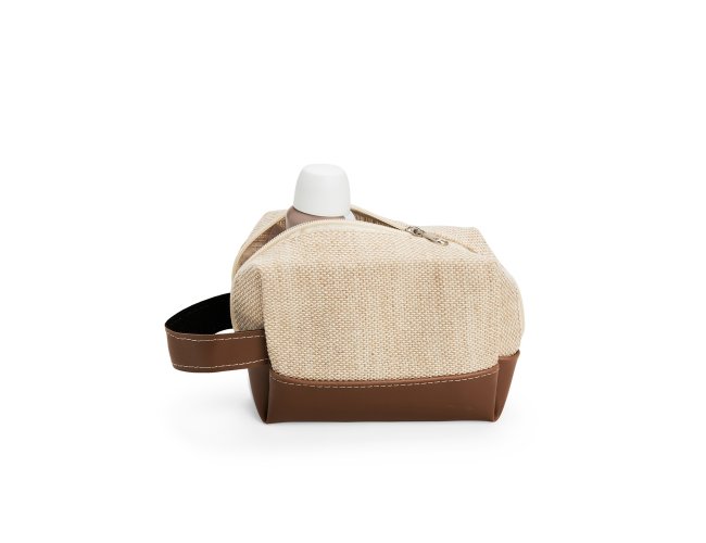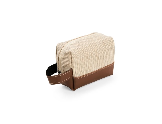 Nécessaire confeccionado em juta, fechamento em zíper, detalhes e alça lateral para mãos em bidim.