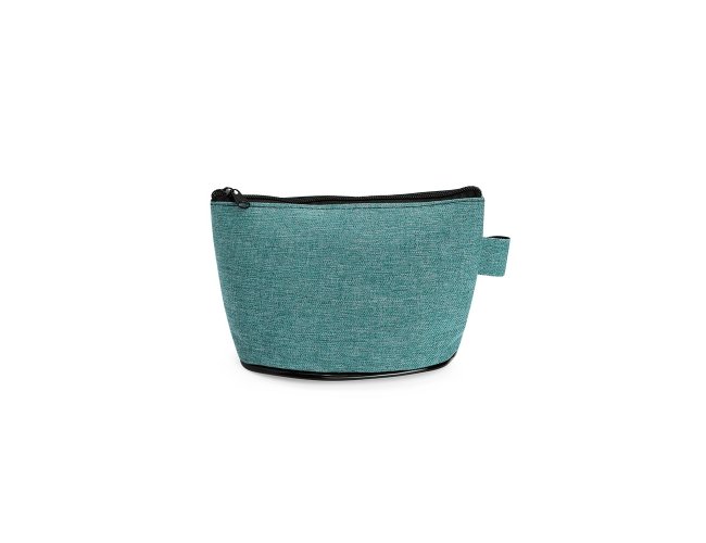 Nécessaire resistente à água e confeccionado em poliéster com mescla de PVC. Possui fechamento em zíper e uma pequena alça para fixação de chaveiro ou gancho.