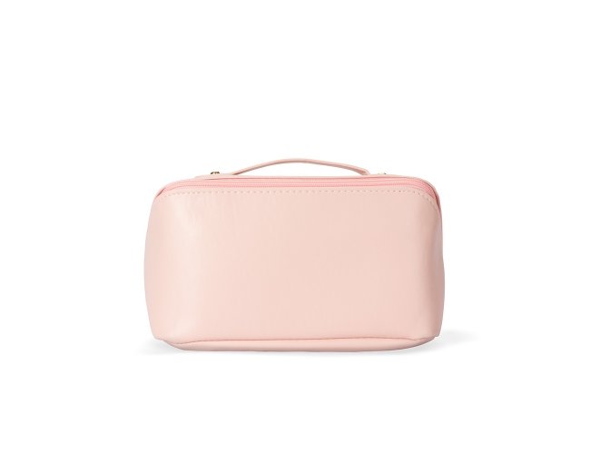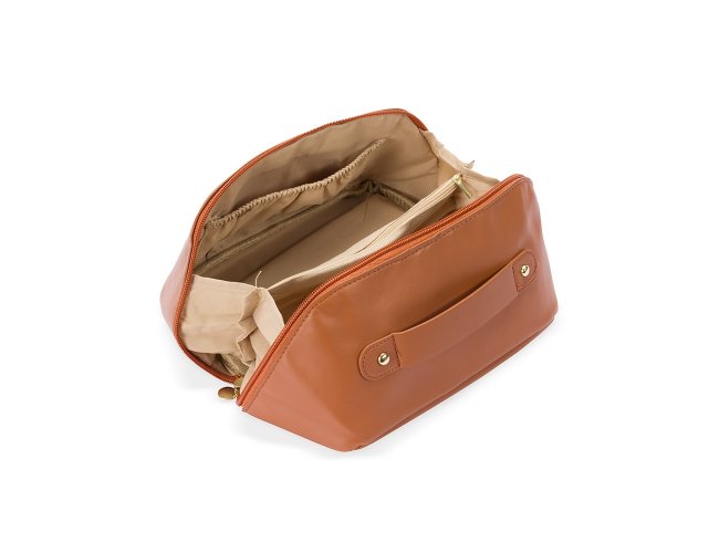 Nécessaire confeccionado em poliuretano (PU) impermeável com abertura em 180 graus que remete ao formato de uma concha. Possui amplo compartimento interno com dois bolsos laterais abertos e um central com fechamento em zíper. Contém uma alça para transporte.