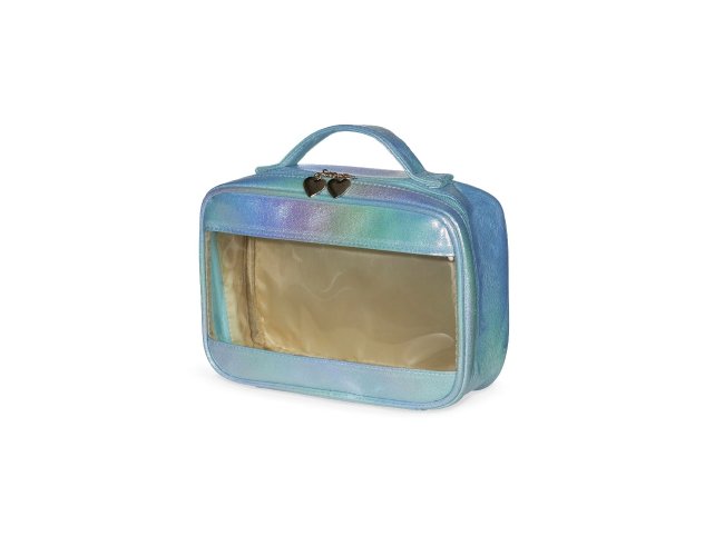 Nécessaire de pvc e tecido sintético com design holográfico, resistente à água.