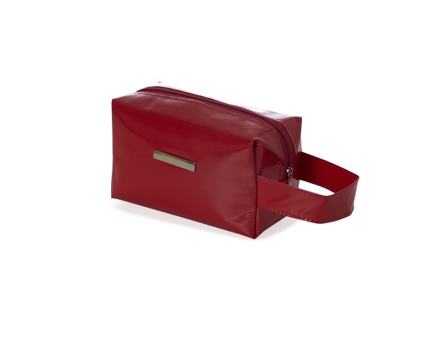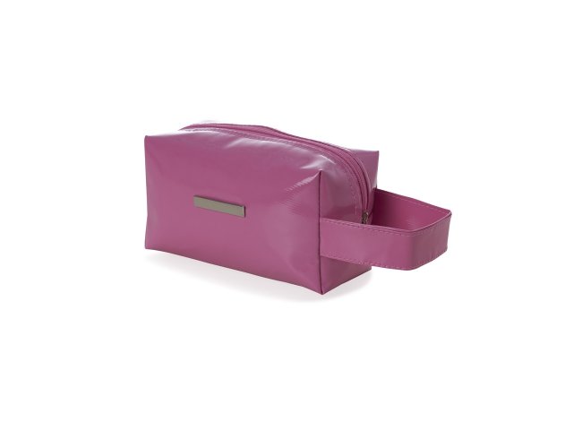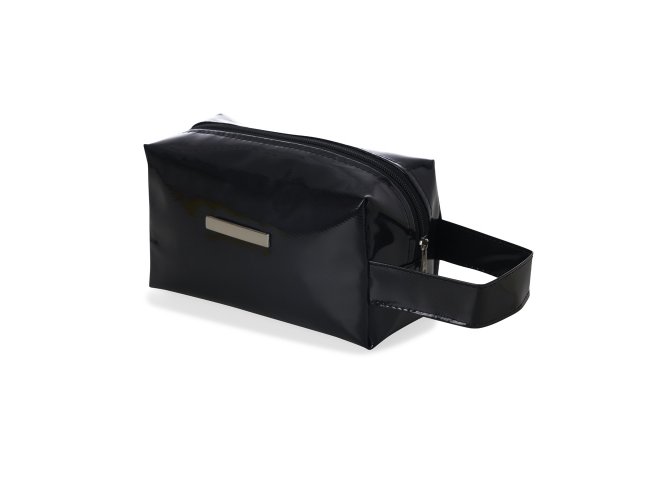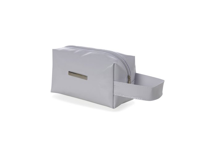 Nécessaire impermeável de vinil com plaquinha metálica para personalização, possui alça lateral, zíper e forro de tnt. Possui plaquinha metálica fixa no centro, para gravação