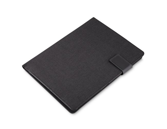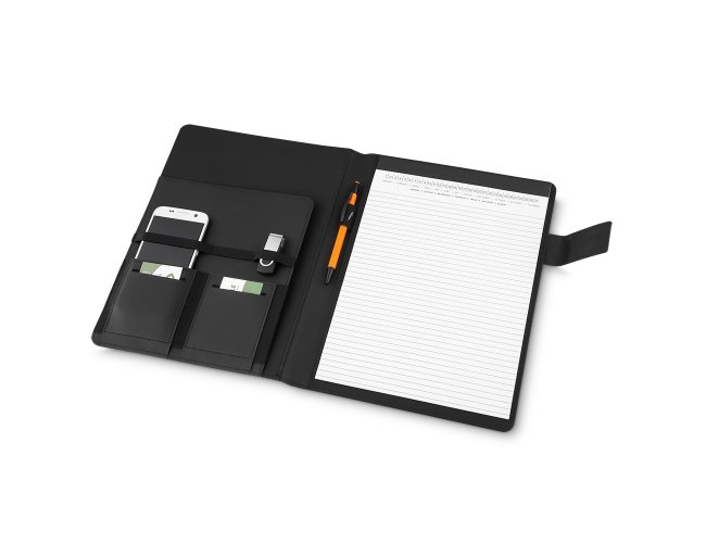 Pasta convenção de tecido sintético, possui fecho magnetizado com plaquinha para personalização em preto fosco. Parte interna com compartimento grande para arquivar documentos,três divisórias elásticas, duas divisórias para celular e cartões, suporte elástico para caneta e bloco com aproximadamente 20 folhas brancas pautadas com dias do mês na área superior.