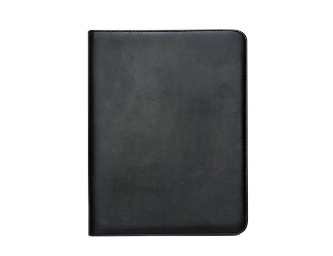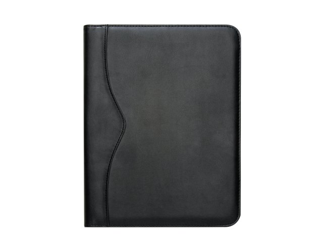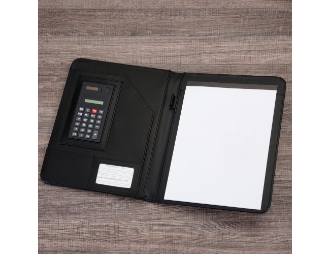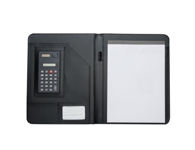 Pasta convenção de couro sintético, possui calculadora solar plástica de 8 dígitos, suporte para cartão, suporte com visor para cartão de identificação, suporte para arquivar documentos, suporte para caneta(não acompanha caneta) e bloco com 20 folhas pautadas.