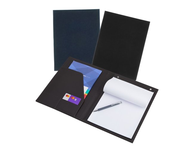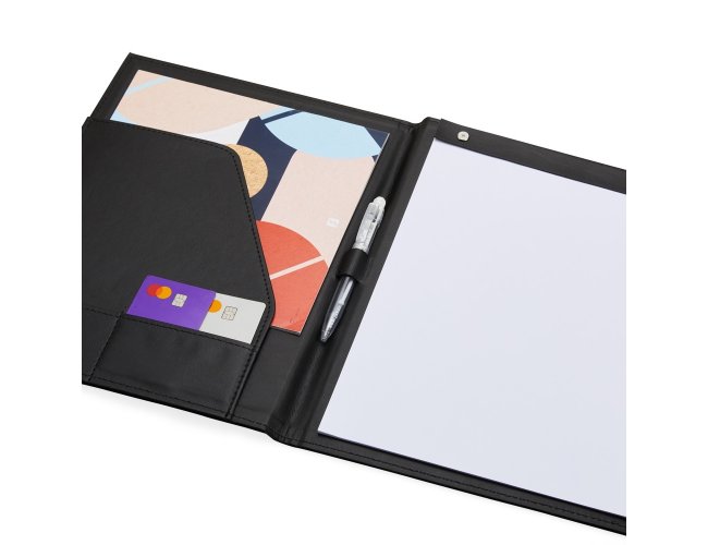 Pasta convenção de couro sintético, possui porta caneta, compartimento para arquivar documentos, dois bolsos para cartões e um bloco com aproximadamente 25 folhas brancas não pautadas.
