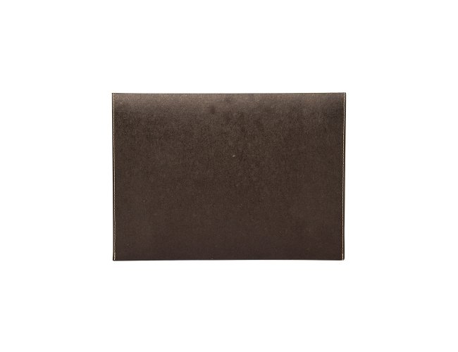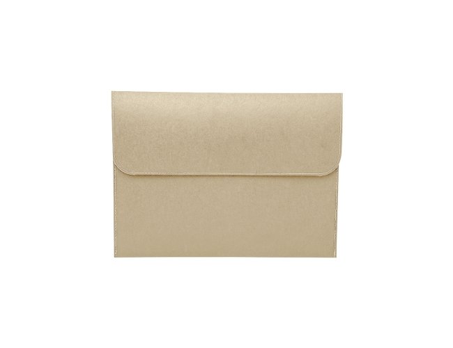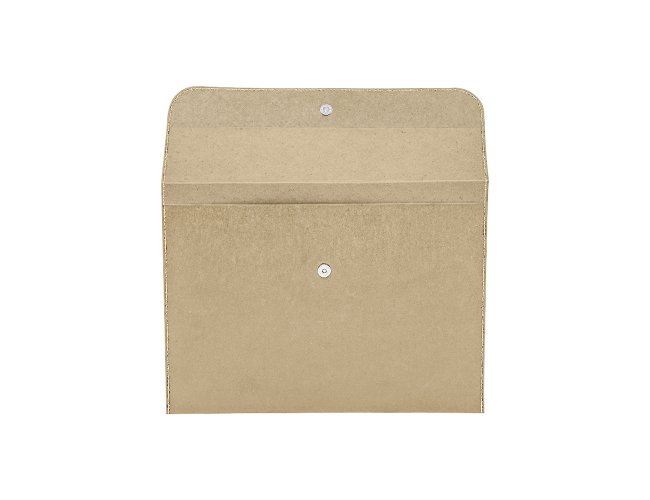 Pasta envelope ecológica feita em kraft e detalhes costurados nas laterais. Possui abertura superior e fechamento com botão metálico imantado.