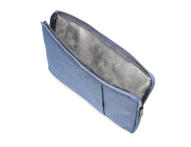 Pasta para notebook 14 em poliéster resistente à água com dois compartimentos, sendo o principal com interior forrado e almofadado.