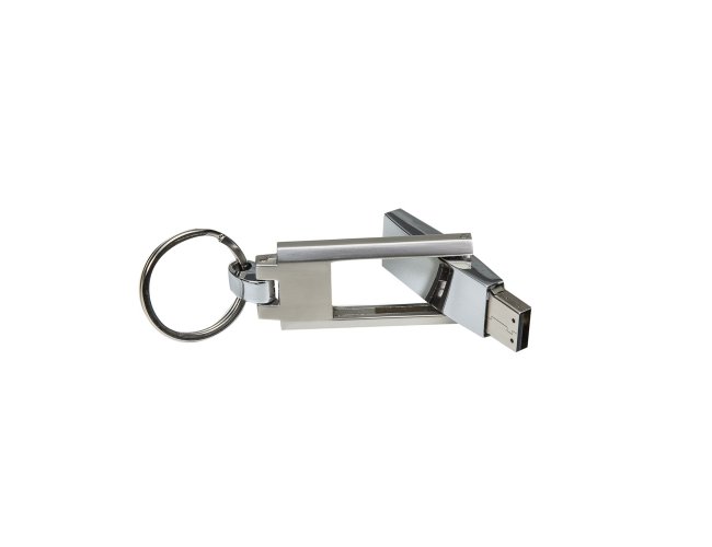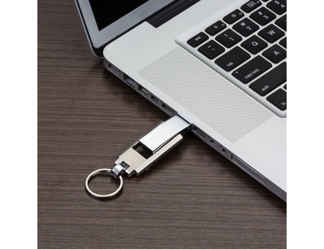 Pen drive grande de metal com chaveiro. Suporte fosco e compartimento do pen drive brilhante, basta puxá-lo e girá-lo para utilização.