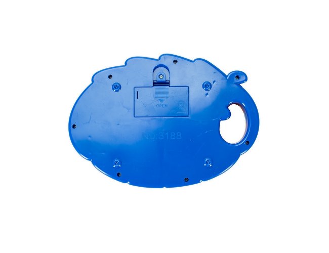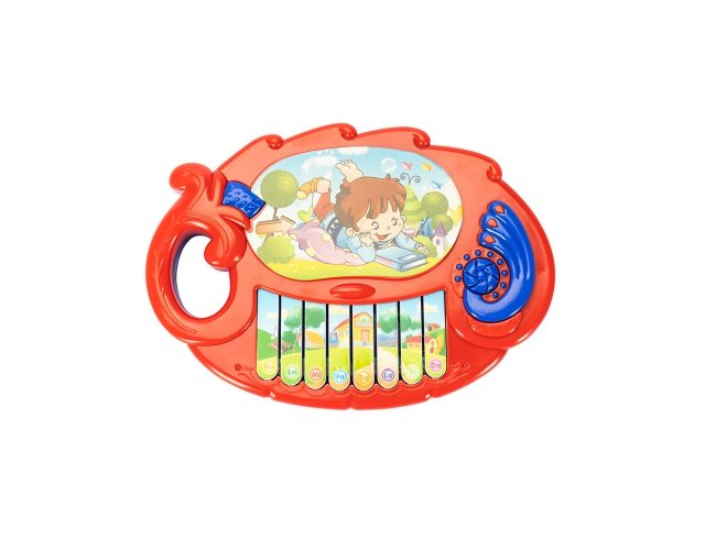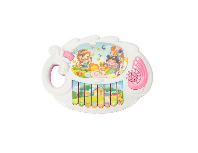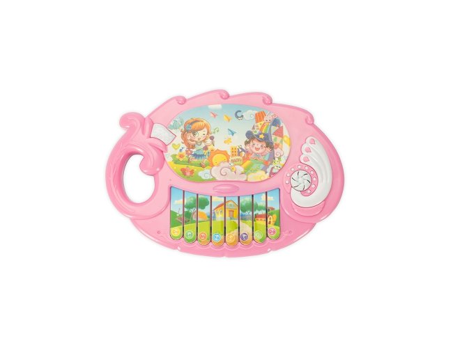 Piano de brinquedo em plástico com teclas interativas que reproduzem músicas pré-gravadas. Possui adesivos decorativos e detalhes texturizados, além de alça lateral. Funciona com duas pilhas AA não inclusas.