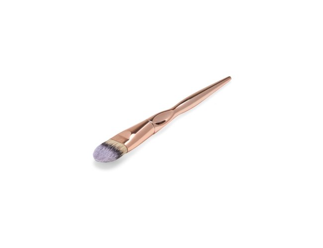 Pincel com cabo plástico em formato ergonômico. Possui cerdas sintéticas macias dispostas em formato de língua de gato, ideal para a aplicação de bases e corretivos líquidos.
