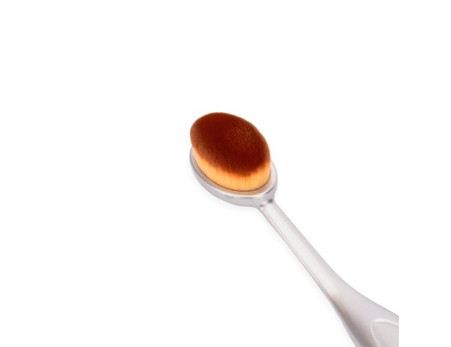 Pincel de maquiagem com design do tipo escova em plástico. Possui cerdas macias dispostas em formato oval, ideal para a aplicação suave de bases líquidas ou em creme.