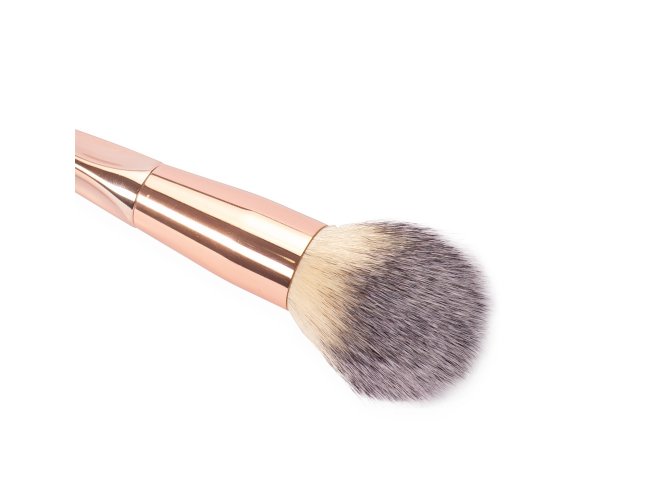 Pincel de maquiagem com cerdas sintéticas macias e cabo ergonômico feito em plástico, ideal para a aplicação de pó compacto no rosto.