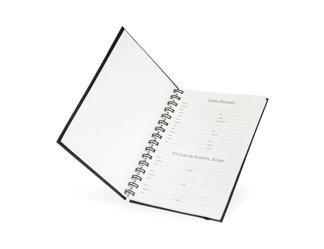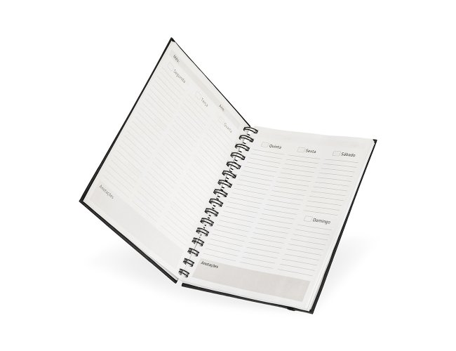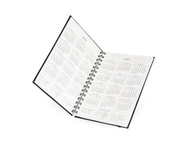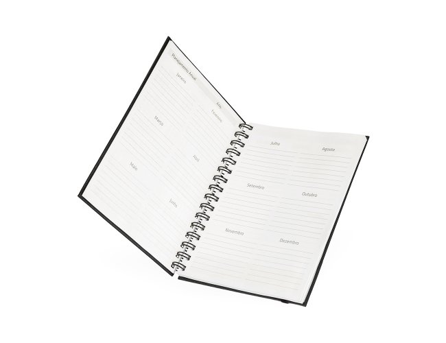 Planner com capa dura em cromato, marca-páginas em fita de cetim e elástico para fechamento. Apresenta páginas dedicadas a dados pessoais, calendários de 2025 a 2027 e espaços para anotações diárias e semanais durante todo o ano.