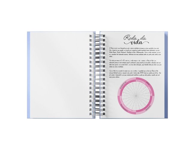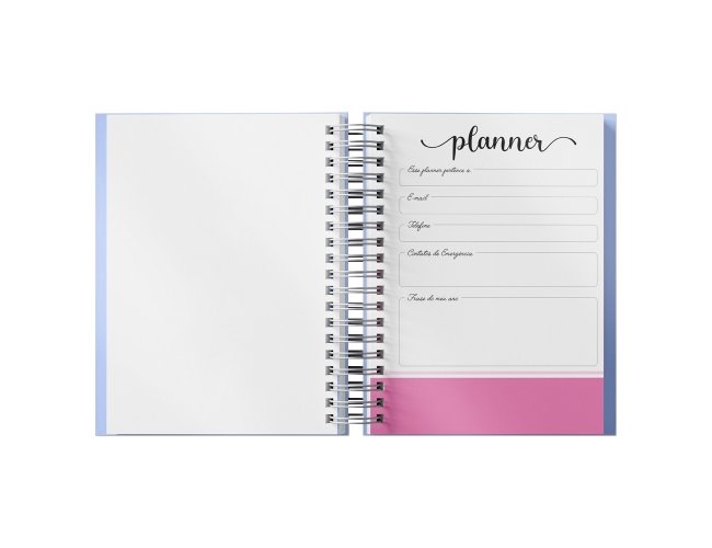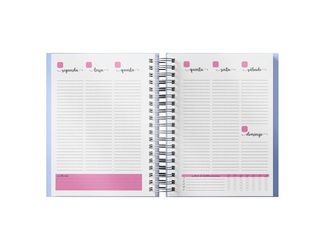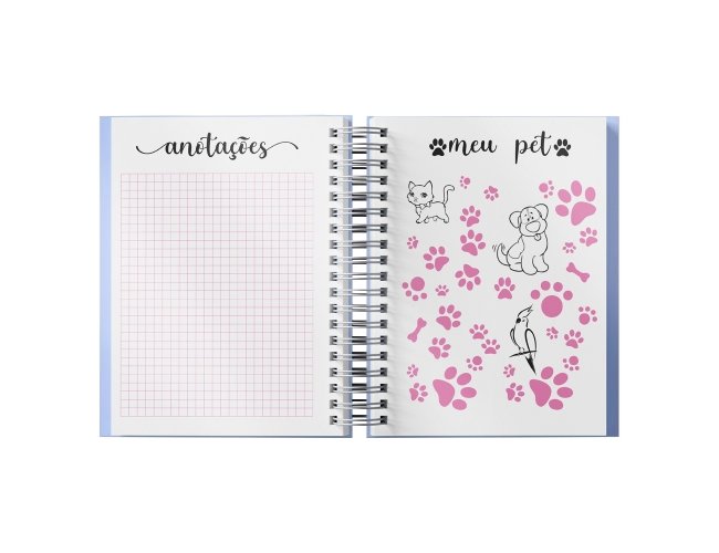 Planner anual em percalux com calendários mensais e semanais. Não possui datas fixas. Além dos calendários o planner contém páginas de identificação, roda da vida, datas importantes, senhas e acessos, contatos, metas anuais, planejamento anual, livros para ler, filmes para ver, minhas séries, controle financeiro, metas financeiras, despesas previstas, contas parceladas, saúde financeira, cuidados com a saúde, meu ano em pixel, e uma parte especial pets para registrar as informações, cuidados, compromissos, cronograma alimentar, vermífugos e vacinas.