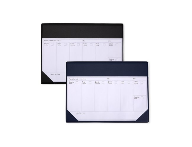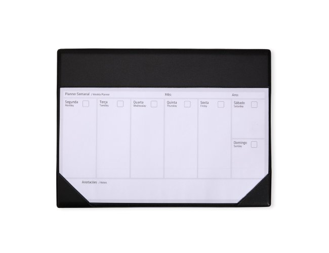 Planner semanal de mesa com base em papelão revestida em PVC. Acompanha bloco com cerca de 20 folhas destacáveis em tamanho A4 para anotações semanais.