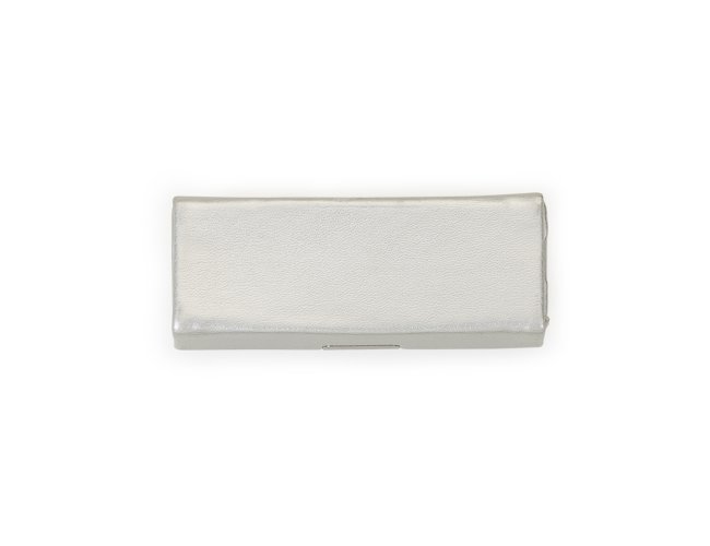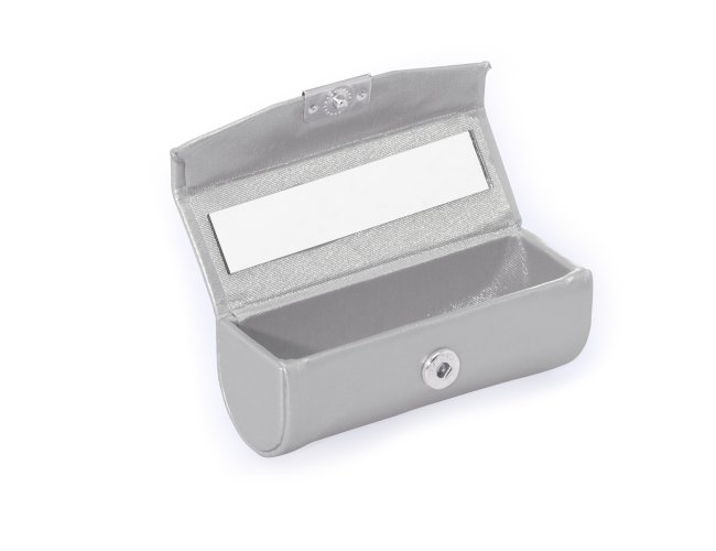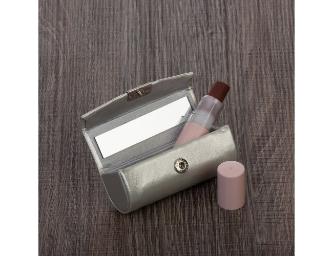 Porta batom em couro sintético prata com plaquinha de metal frontal com botão para abrir/fechar, possui um espelho interno.