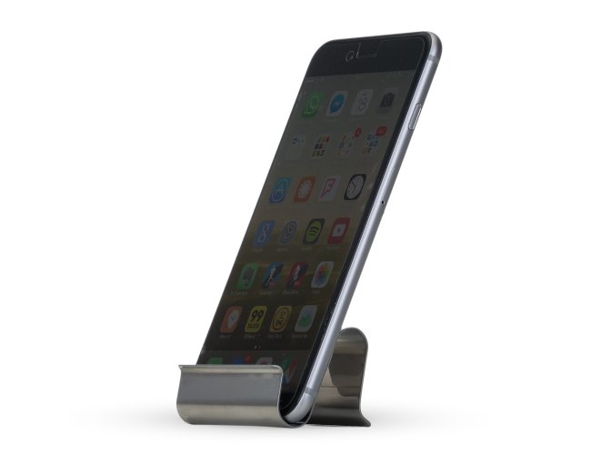 Porta celular brilhante em inox, chapa metálica encurvada e suporte traseiro soldado para dar apoio à peça ficar ereta.