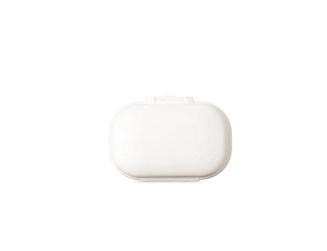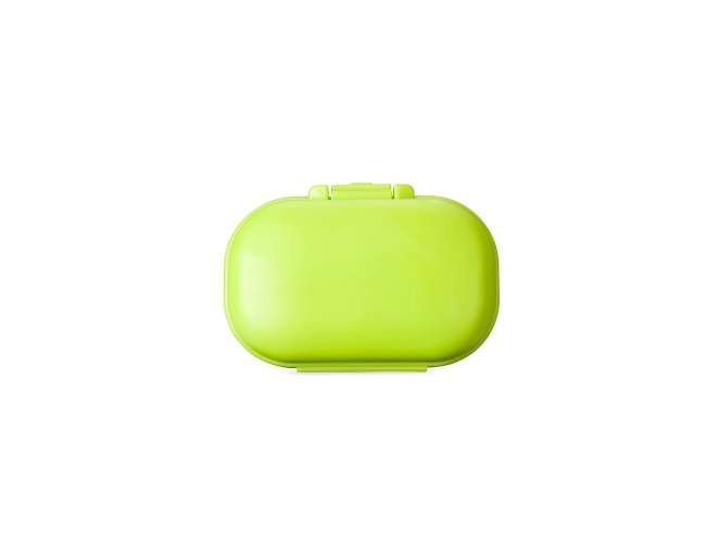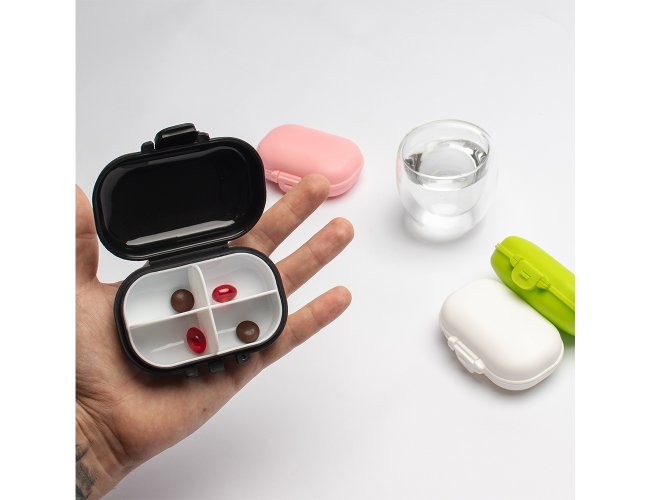 Porta-comprimidos feito em plástico. Possui compartimento removível com quatro divisórias, o que facilita a limpeza e ajuda a organizar medicamentos ou pequenos objetos.