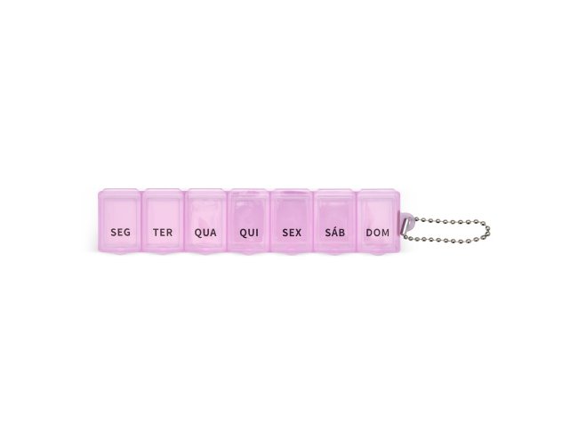 Porta-comprimidos em plástico com sete divisórias com capacidade de até 10ml. Cada compartimento é identificado com a abreviação de um dia da semana. Acompanha uma corrente de bolinhas para encaixe no organizador.