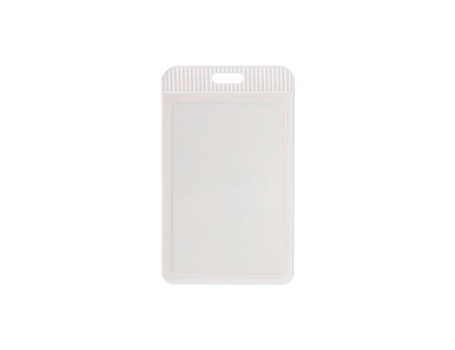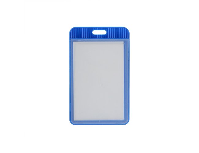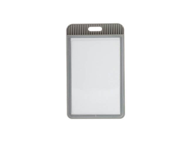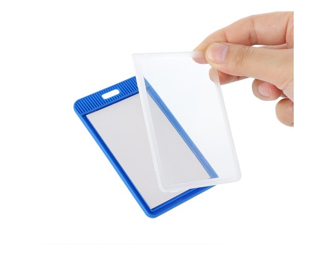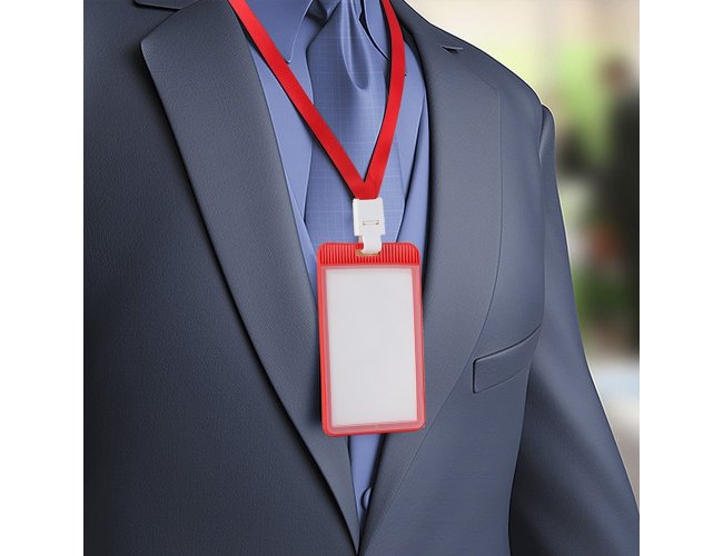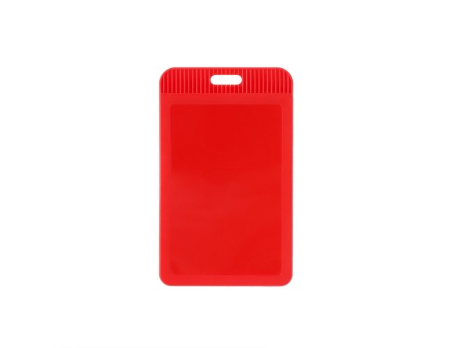 Porta crachá ou porta credencial em plástico resistente. Suporte com visor transparente removível e abertura superior para prender o cordão.