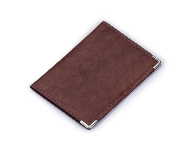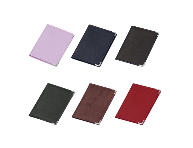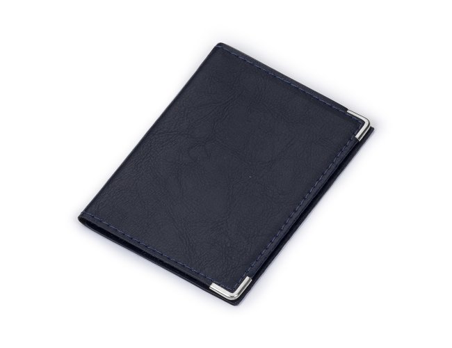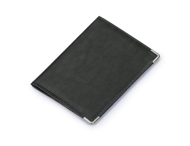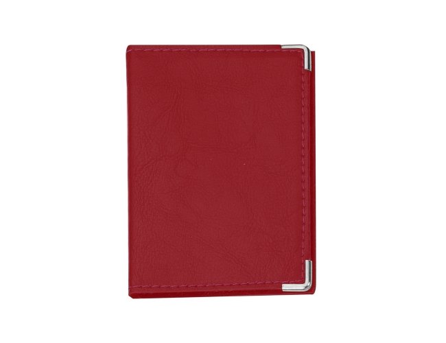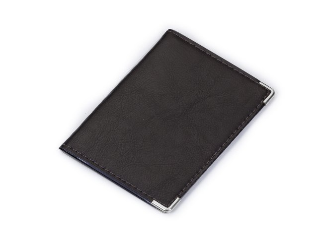 Porta-documento em couro sintético com cantoneira prata, possui 4 divisórias plásticas grande e duas divisórias pequenas.