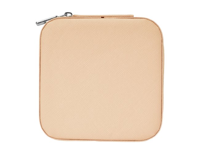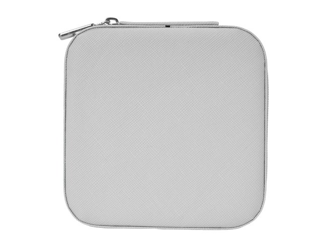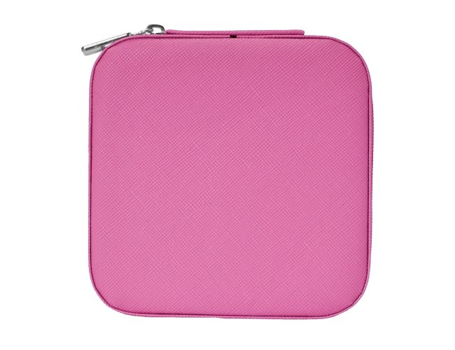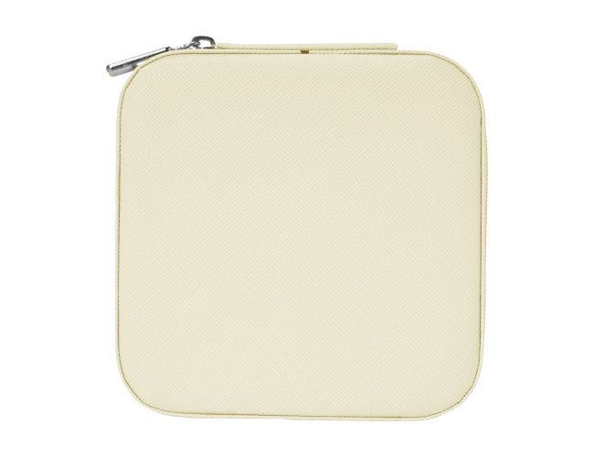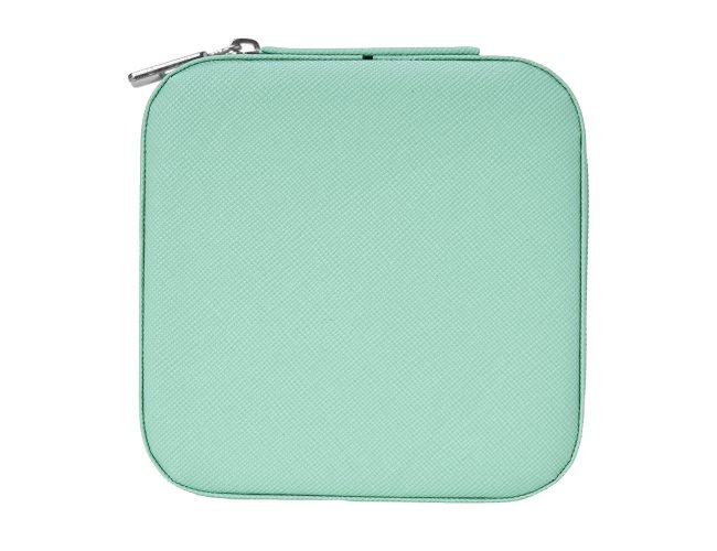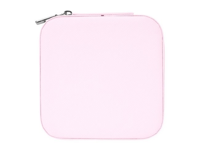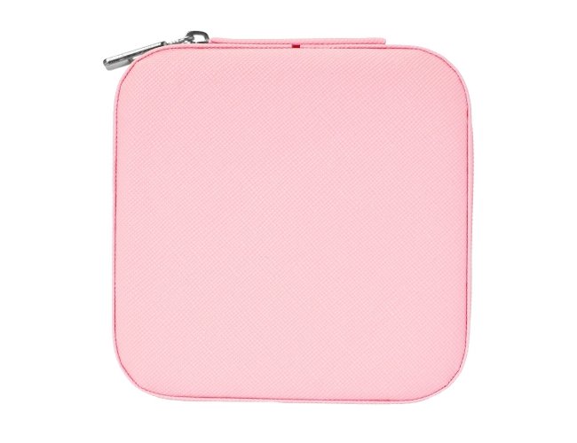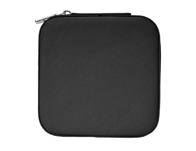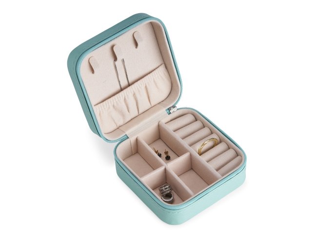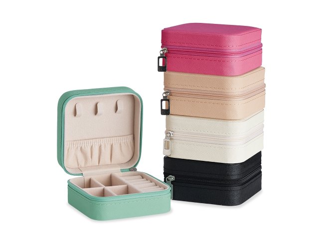 Porta-joias quadrado em couro sintético com revestimento interno em tecido aveludado. Possui bolso elástico e três ganchos pequenos na parte interna da tampa, além de divisória multiuso e repartição almofadada com ranhuras para anéis, ambos localizadas no compartimento principal.