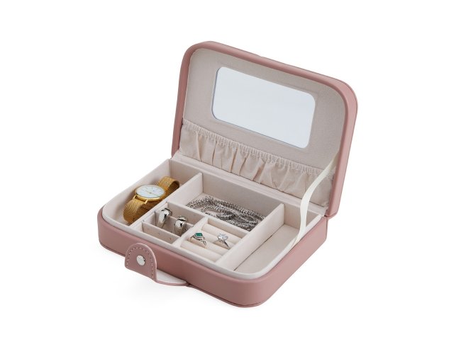 Porta-joias em couro sintético com revestimento aveludado e espelho. Possui compartimentos internos para anéis, pulseiras, colares e placas para brincos.