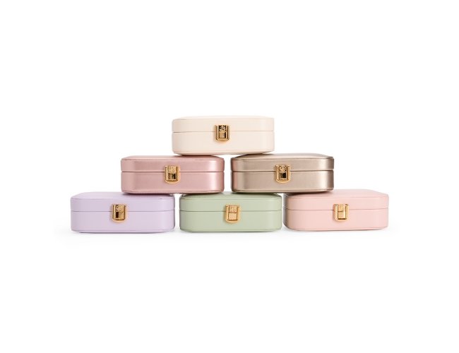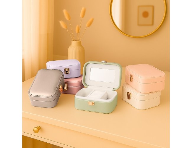 Porta-joias em poliuretano (PU) e revestimento interno em tecido aveludado. Conta com espelho interno, duas divisórias, repartição almofadada com ranhuras e trava de segurança.