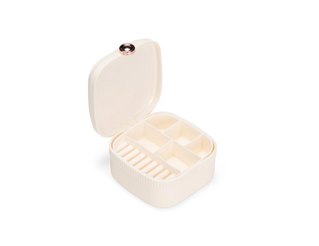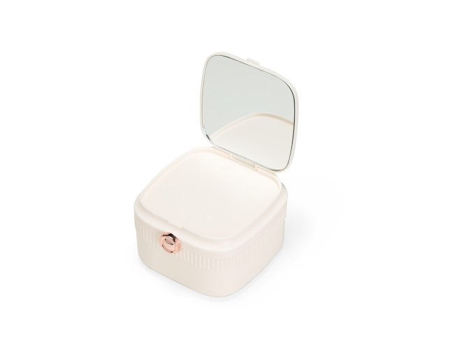 Suas joias merecem um lugar especial, e com este porta-joias, manter os acessórios organizados e protegidos nunca foi tão fácil e elegante. Produzido em plástico e de design compacto, sua abertura principal é cheia de glamour, destacada por um lindo botão na cor rose gold. Sua parte interna conta com três compartimentos: um removível e emborrachado, ideal para anéis, brincos e colares, e outro com divisória, perfeito para itens maiores como batons, pulseiras ou o que mais desejar. Além disso, possui um compartimento com espelho embutido, tornando o momento de se arrumar ainda mais especial na hora de escolher os acessórios.