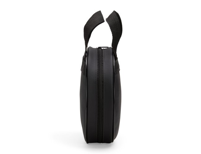 Bolsa porta-pratos em couro sintético e fechamento em zíper. Possui compartimento interno que inclui bolso em tela de nylon, além de duas alças para transporte.