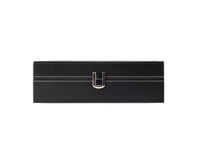 Porta-relógios com acabamento em couro sintético à base de PVC e revestimento interno em veludo. Conta com 10 compartimentos fixos com almofadas removíveis em espuma, além de visor de vidro e trava de segurança para o fechamento do estojo.