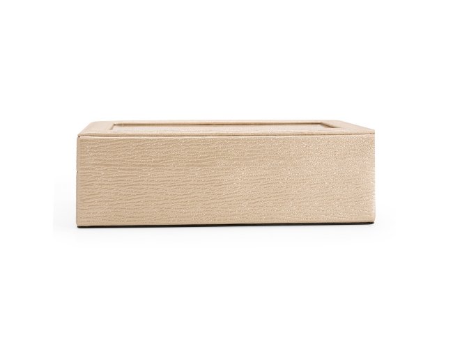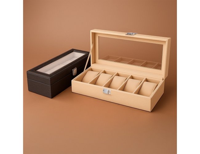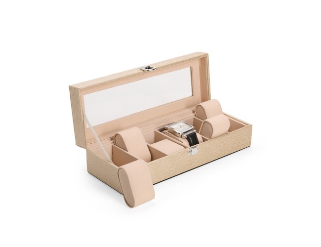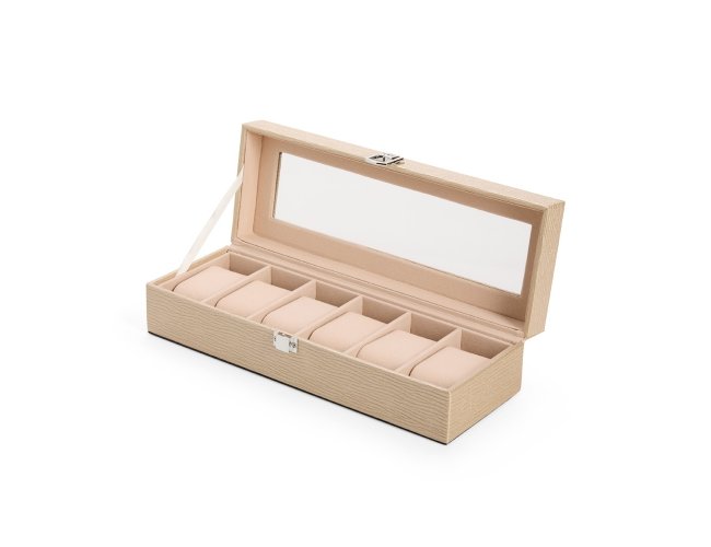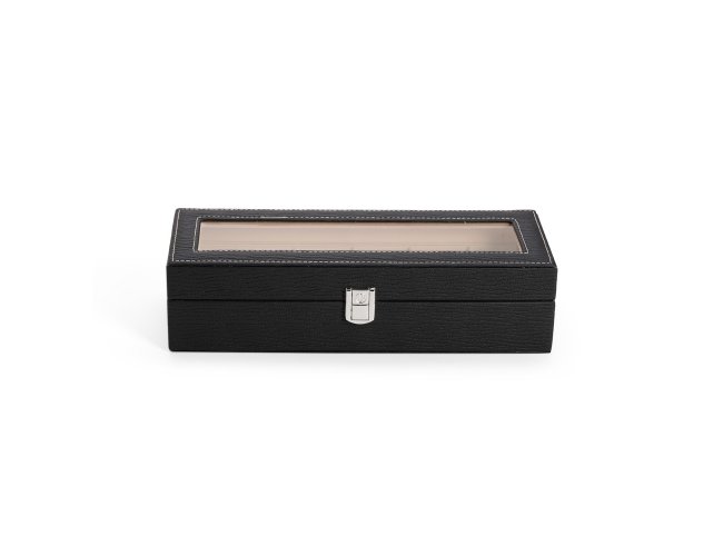 Porta-relógios com acabamento texturizado em couro sintético à base de PVC e revestimento interno em tecido aveludado. Possui seis divisórias com almofadas removíveis, visor de vidro e trava de segurança.